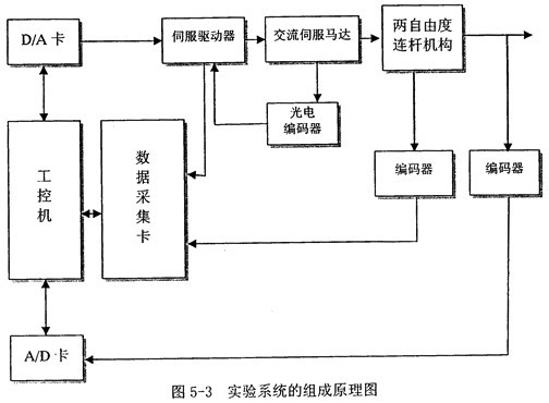 4.數(shù)據(jù)處理:(l)微機(jī)將電機(jī)位置信號作數(shù)值微分求得電機(jī)轉(zhuǎn)速。(2)微機(jī)用數(shù)字濾波程序?qū)⒓铀俣刃盘栕鳛V波、數(shù)值積分等處理。如圖5-3所示為實(shí)驗(yàn)系統(tǒng)的組成原理圖: