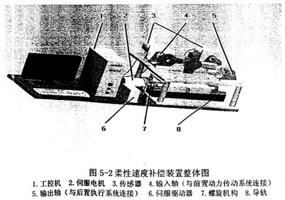 基于圖5-1所示機(jī)構(gòu),配置伺服驅(qū)動裝置、傳感器以及計(jì)算機(jī)控制系統(tǒng),獲得該柔性速度補(bǔ)償裝置的原型,如圖5-2所示。