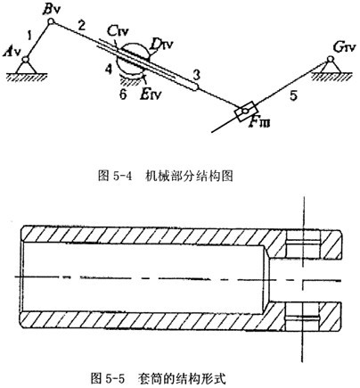 首先將原來的原理圖轉(zhuǎn)換成以下的機(jī)構(gòu)結(jié)構(gòu)圖(僅部分轉(zhuǎn)換),如圖5-4,即原來2、3構(gòu)件之間是滑塊和連桿連接,現(xiàn)改為連桿、套筒改為加一個(gè)擺動軸結(jié)構(gòu),原來滑塊3和地面連接,容易形成過約束,改為加一個(gè)擺動軸承4來和地面、套筒來連接。擺動軸承內(nèi)芯相當(dāng)于一個(gè)球副,其轉(zhuǎn)動中心必為內(nèi)芯的球心,當(dāng)然也是整個(gè)擺動軸承的中心。這樣便于加工查和實(shí)驗(yàn)實(shí)施,而且更重要的是可防止原來原理圖中桿件連接出形成過約束。