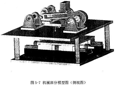 如圖5-1所示為實(shí)驗(yàn)系統(tǒng)機(jī)械部分的模型圖片,為了顯示清楚,沒有配置外邊的機(jī)箱,整個(gè)機(jī)構(gòu)是完全開放式的,這樣也便于實(shí)驗(yàn)觀察。該機(jī)械結(jié)構(gòu)由上下兩個(gè)機(jī)架支撐,和前面的原理圖不同,下邊機(jī)架上放置昆旋導(dǎo)軌構(gòu)件(未顯示伺服電機(jī)),上邊機(jī)架則是上圖所示的其余連桿機(jī)構(gòu)及其支撐架、軸承等(未顯示常速電機(jī))。