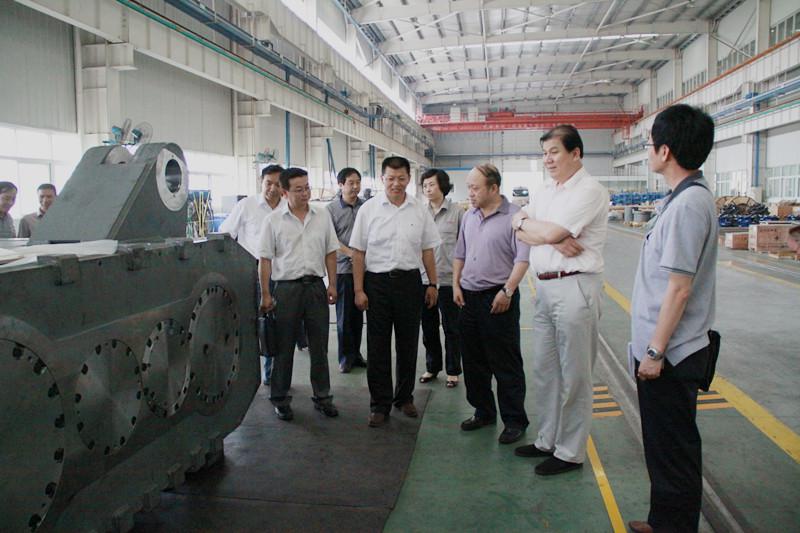 中傳重裝總經(jīng)理李圣強(qiáng)(右三)陪同神華神東董事長張子飛(右二)一行參觀中傳重裝大采高全直齒傳動搖臂裝配現(xiàn)場