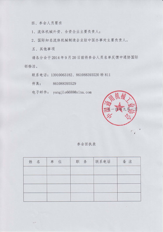 請各分會(huì)于2014年9月20日前將參會(huì)人員名單反饋中通協(xié)國際部楊潔