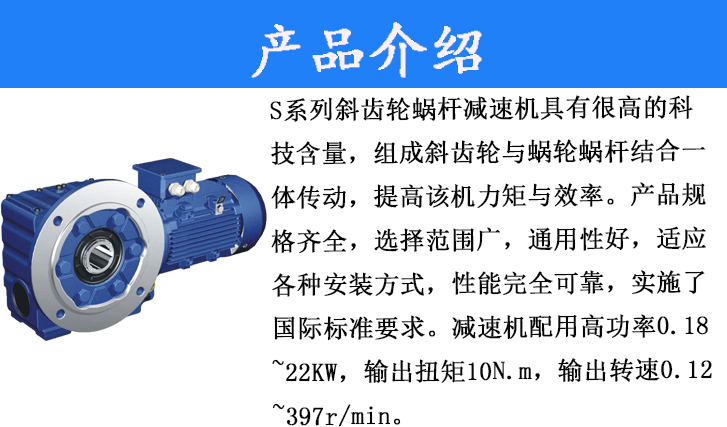 S系列齒輪蝸桿減速電機(jī)具有很高的科技含量,有斜齒輪與蝸輪蝸桿結(jié)合一體傳動,提高該機(jī)力矩與效率。該系列產(chǎn)品規(guī)格齊全,轉(zhuǎn)速范圍廣,通用性好,適應(yīng)各種安裝方式,性能安全可靠壽命長,實施了國際標(biāo)準(zhǔn)要求。減速機(jī)配用高功率0.18~22KW,輸出轉(zhuǎn)距10N.m~4890N.m,輸出轉(zhuǎn)速.12~397r/min。