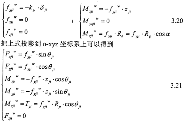 jiw為切向位移,由于前面的假設(shè)中把內(nèi)外齒看成是沿分度圓齒廓法線方向串防的彈簧,因此只有y方向的位移對(duì)彈簧起到壓縮作用,而x方向的相對(duì)位移對(duì)彈簧起到壓縮是高階小量,可以忽略。