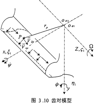 圖3.10是,齒輪聯(lián)軸器第i個(gè)齒對(duì)的模型,設(shè)內(nèi)齒套中心為oa1,相對(duì)定坐標(biāo)為o-xyz的速度為: