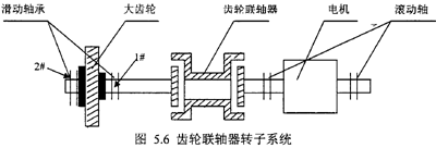 圖5.6是國產(chǎn)DH型透平壓縮機(jī)結(jié)構(gòu)簡圖1-2中,齒輪軸(簡稱G軸)、電機(jī)、齒輪聯(lián)軸器、軸承組成的轉(zhuǎn)子系統(tǒng)。這是我們主要研究對象。