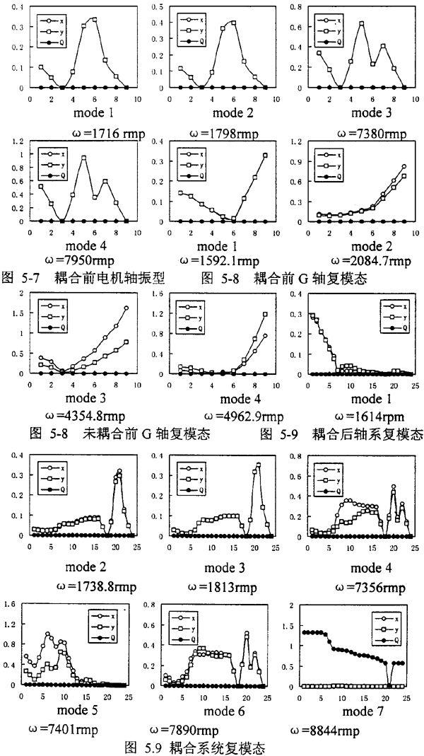 耦合轉(zhuǎn)子系統(tǒng),在上面給定轉(zhuǎn)速范圍內(nèi),共有7階模態(tài)(見圖5.9),比耦合前兩根轉(zhuǎn)子的總模態(tài)數(shù)少1個,耦合系統(tǒng)的模態(tài)可以分為兩類,(1)第一類為單個轉(zhuǎn)子模態(tài)占主要成分,其他轉(zhuǎn)子沒有或僅有很小的模態(tài)成價,圖5.9,mode1、mode2、mode3、mode5這類模態(tài)容易從單根模態(tài)中找到對應(yīng)的原形;(2)第二類為耦合模態(tài),這一類模態(tài)又可以分為二種:一種是耦合彎曲耦合橫態(tài),例如圖5-9mode4、mode6;第二種耦合模態(tài)是扭轉(zhuǎn)耦合模態(tài)如圖5.9mode7,這種模態(tài)是系統(tǒng)中同時有多個轉(zhuǎn)子產(chǎn)生了耦合模態(tài),是耦合派生的,不易從單根模態(tài)中找到對應(yīng)的原形,另外我們從振型圖中沒有發(fā)現(xiàn)彎扭耦合振型出現(xiàn),這各上一章得到的結(jié)果相同,既在對中比較好的系統(tǒng)中,齒輪聯(lián)軸器只可能在高階中出現(xiàn)較小的彎扭耦合模態(tài)。