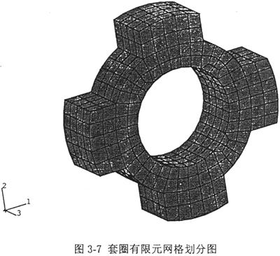 套圈是一個(gè)不規(guī)則的零件,先用有限元按三維八節(jié)點(diǎn)實(shí)體單元對它進(jìn)行網(wǎng)格劃分,圖3-7是有限元網(wǎng)格劃分圖。邊界條件是這樣處理的:由于套圈裝在減速機(jī)箱體孔中時(shí),和孔的配合是過盈配合,且套圈內(nèi)表面與傳動(dòng)軸外表面也是過盈配合,故套圈的配合面處均按固支對待。經(jīng)ABAQUS有限元軟件處理后輸出質(zhì)量矩陣和剛度矩陣,然后用廣義的Collatz包含定理求出它的低階固有頻率。