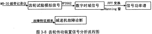 圖3-8是齒輪傳動(dòng)裝置信號分析流程圖,用HP3562動(dòng)態(tài)數(shù)字分析儀采集MR-30磁帶記錄儀紀(jì)錄的二級圓柱斜齒輪減速機(jī)試驗(yàn)過程中的模擬信號,可得到齒輪傳動(dòng)裝置載荷、齒輪傳動(dòng)裝置箱體動(dòng)態(tài)激勵(lì)力應(yīng)變變化的時(shí)域信號,對此信號作FFT變換,可得到載荷譜和動(dòng)態(tài)激勵(lì)力應(yīng)變變化時(shí)域信號的功率譜。為了防止功率譜泄露,在作FFT變換時(shí),需作加窗處理,由于試驗(yàn)采集的是隨機(jī)信號,故加漢寧(Hanning)窗處理。利用故障診斷特征參數(shù)-傳動(dòng)零件可能發(fā)生故障的振動(dòng)頻率及其振動(dòng)頻率處的功率對試驗(yàn)信號進(jìn)行診斷分析。當(dāng)功率譜所包含的頻率成份難以區(qū)分時(shí),可采用倒譜分析。
