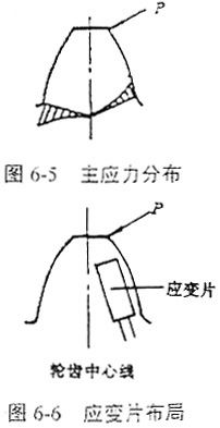 鼓形齒聯(lián)軸器內(nèi)外齒輪的嚙合齒對承受所作用的轉(zhuǎn)矩的作用,一般情況下,內(nèi)齒輪輪齒的剛度大于外齒輪輪齒的剛度,為了能更有效地反映應(yīng)變,工作應(yīng)變片貼于外齒輪輪齒的端面,溫度補償應(yīng)變片貼于不受力的相同材料上。輪齒的應(yīng)力狀態(tài)較復(fù)雜,在齒根處還存在應(yīng)力集中的情況下,但總的來說,對于一個齒,其齒根主應(yīng)力分布如圖6-5所示,因此考慮工作應(yīng)變片貼于輪齒中心線受拉應(yīng)力的一側(cè),靠近齒根邊緣處。這樣既不影響齒的嚙合,又能有效地反映接觸狀況,貼片布局如圖6-6所示。由于輪齒端面位置較為狹小,無法貼兩片應(yīng)變片,因此采用單臂工作方式測試。試件的選擇應(yīng)考慮加載量及貼片方便兩方面的因素,選擇模數(shù)較大的試件,便于貼片操作,但所需要加的載荷也較大,給操作帶來困難;反之則加載方便,但貼片較困難。綜合考慮上述兩方面的因素,并考慮能反映工業(yè)應(yīng)用的實際情況,本實驗選用實際使用的鼓形齒聯(lián)軸器為試件,齒輪模數(shù)m=3mm,齒數(shù)z=56,其內(nèi)外齒加工精度分別為7級和6級,材料均為ZG45鋼,熱處理為調(diào)質(zhì)處理,兩個鼓形齒輪分別為圓弧鼓度曲線和優(yōu)化鼓度曲線。
