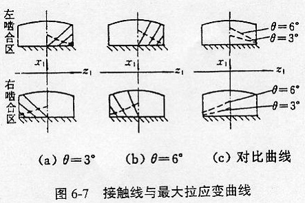 以一實際鼓形齒聯(lián)軸器為研究對象,其齒數(shù)均為Z=40,模數(shù)m=3mm,內(nèi)齒輪齒寬b=30mm,鼓形外齒輪寬b=20mm,E=2.1×105N/mm2,μ=0.3,工作軸間傾角分別為θ=3°和θ=6°兩種情況。由文獻[120]可知,其瞬時接觸線在一嚙合區(qū)內(nèi),內(nèi)齒輪齒面上的瞬時接觸線是自下向左上斜的曲線,外齒輪齒面上的瞬時接觸線是自下向右上斜的曲線;在另一嚙合區(qū)恰好相反,據(jù)此可確定瞬時載荷的作用位置,并假定載荷沿接觸線均勻分布,且傳遞最大扭矩。根據(jù)以上參數(shù)和文獻[121]的計算模型,應(yīng)用三維彈性邊界元計算程序計算了在鼓形齒聯(lián)軸器轉(zhuǎn)過一個齒距角的過程中,鼓形外齒輪某一輪齒的三個特定嚙合狀態(tài)下的形變分量,即開始進入嚙合、嚙合中間和即將脫離嚙合三種狀態(tài)。計算發(fā)現(xiàn)在每種嚙合狀態(tài)下的相應(yīng)接觸線上中點附近沿齒高方向(x方向)的形變分量為最大。將各嚙合狀態(tài)下沿齒高方向取最大形變分量的點用光滑曲線連起來,即為該齒輪在傳動嚙合過程中引起齒面產(chǎn)生裂紋痕跡主要誘因最大拉應(yīng)變εx的分布規(guī)律或走向。其鼓形外齒輪某輪齒在傳動嚙合過程中的接觸線及相應(yīng)的最大拉應(yīng)變εx的分布曲線如圖6-7所示。圖6-7(a)與圖6-7(b)分別為軸間工作傾角θ=3°和θ=6°的情況,圖6-7(c)為最大拉應(yīng)變εx隨θ而變化的對比曲線,其中實線為接觸線,虛線為最大拉應(yīng)變εx的分布曲線。
