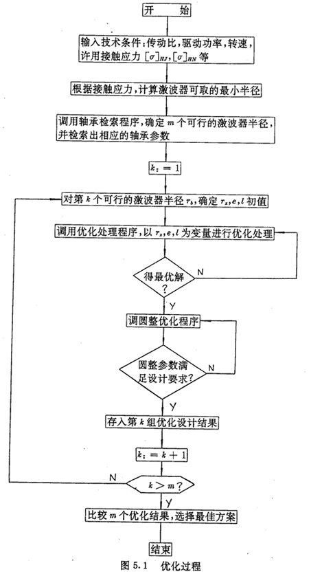 由于激波器一般使用通用軸承,所以激波器半徑Tb應(yīng)結(jié)合軸承標(biāo)準(zhǔn)來(lái)選擇。在程序中,先給各傳動(dòng)參數(shù)指定其取值范圍的中間數(shù)值,然后根據(jù)接觸應(yīng)力計(jì)算,確定滿足強(qiáng)度條件的最小激波器半徑,由軸承檢索程序,確定若干個(gè)可行的激波器半徑。在確定可行的激波器半徑時(shí),為了使減速器外徑尺寸不致過(guò)大,僅把與應(yīng)力計(jì)算結(jié)果相近的軸承半徑及其相鄰型號(hào)半徑作為可行的激波器半徑。對(duì)每一個(gè)可行的激器半徑Tb,調(diào)用優(yōu)化子程序以Tz,e,l為優(yōu)化變量進(jìn)行優(yōu)化處理。其算法流程如圖5.1所示。