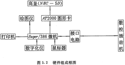 本系統(tǒng)是在一臺(tái)微型計(jì)算機(jī)super/386基礎(chǔ)上,增加一塊選進(jìn)的圖形卡,一臺(tái)高分辨率顯示器,數(shù)控接口電路及相應(yīng)設(shè)備,組成了一個(gè)微機(jī)工作站,如圖5.2所示。