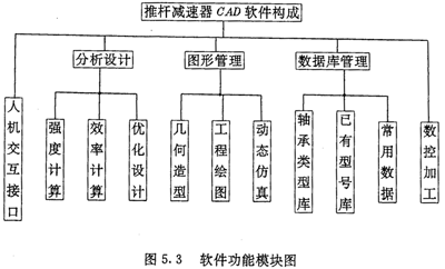 軟件主要由分析設(shè)計(jì)、圖形管理、數(shù)據(jù)庫(kù)管理及摟控加工四大部分組成,并提供了一個(gè)友好的人機(jī)交互接口界面用于實(shí)現(xiàn)漢字人機(jī)對(duì)話。本交互接口由三級(jí)推拉彈出式菜單組成。軟件模塊結(jié)構(gòu)如圖5.3所示。各大模塊的主要功能及特點(diǎn)如下: