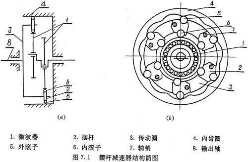 圖7.1所示為擺桿減速器的結(jié)構(gòu)簡圖。擺桿減速器也由四大部分組成:激波器1;擺動機構(gòu)(包括擺桿2,內(nèi)滾子6, 外滾子5和軸銷7);傳動圈3 以及與其固聯(lián)的輸出軸8;內(nèi)齒圈4?梢钥闯,除了擺動機構(gòu)外,其它構(gòu)成與推桿減速器類似。也采用了兩套完全相同且互成180°的激波器及內(nèi)齒圈以實現(xiàn)輸出的靜平衡和提高嚙合效率。