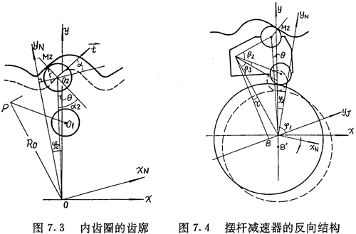 和推桿減速器一樣,當(dāng)理論擺動機構(gòu)數(shù)目比內(nèi)齒圈齒數(shù)少,即ZC=ZN-1時,機構(gòu)成為圖7.4所示的反向結(jié)構(gòu),在此結(jié)構(gòu)中,擺桿外滾子中心在與內(nèi)齒圈固聯(lián)的坐標(biāo)系(o,xN,yN)中的軌跡方程是:
