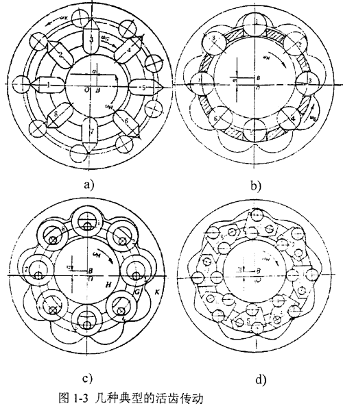 活齒傳動(dòng),全稱為“活齒少齒差行星齒輪傳動(dòng)”,是一種由K-H-V 型少齒差行星齒輪傳動(dòng)演化而成的一種新型齒輪傳動(dòng)。它的特點(diǎn)是固定輪上的齒形制成圓弧或其他曲線,行星輪上的各輪齒改用單個(gè)的活動(dòng)構(gòu)件(如滾柱)代替,而這些構(gòu)件分別置于輸出軸上沿周向分布的槽孔中,當(dāng)主動(dòng)偏心構(gòu)件(波發(fā)生器)驅(qū)動(dòng)時(shí),它們將在槽孔中活動(dòng),故稱為“活齒”。常見的活齒傳動(dòng)分為推桿活齒傳動(dòng)(圖1-3a)、滾柱(鋼球)活齒傳動(dòng)(圖1-3b)、套筒活齒傳動(dòng)(圖1-3c)、擺動(dòng)活齒傳動(dòng)(圖1-3d)等;铨X結(jié)構(gòu)形式最初是由德國人于30 年代提出的,40 年代德國將活齒傳動(dòng)技術(shù)應(yīng)用于汽車的轉(zhuǎn)向機(jī)構(gòu)中。60 年代前后,美國、前蘇聯(lián)、英國、聯(lián)邦德國等國都先后開展了研究工作。前蘇聯(lián)研究了“柱塞傳動(dòng)”(活齒傳動(dòng)的一種型式),提出了它的運(yùn)動(dòng)分析和力分析的計(jì)算方法。美國學(xué)者提出了推桿活齒減速器傳動(dòng)裝置,分析了傳動(dòng)原理,對傳動(dòng)比和作用力進(jìn)行了計(jì)算,分析了其傳動(dòng)性能。英國推出了“滑齒減速器”。80年代,前蘇聯(lián)學(xué)者HLHATHIIIeB.P.M推出了另一種活齒傳動(dòng)形式即“正旋滾珠傳動(dòng)”,并研究了正旋滾珠活齒傳動(dòng)的嚙合理論、強(qiáng)度特性、走和性能等。前蘇聯(lián)還將正旋滾珠減速器用于石油鉆探中,成功地解決了渦輪鉆具轉(zhuǎn)速過高的難題。英國也曾對活齒傳動(dòng)減速器進(jìn)行了系列生產(chǎn),單給傳動(dòng)的傳動(dòng)比為20~80,效率為86%~87%,也有雙級和三級傳動(dòng),功率N<25馬力。80年代才真正開始的,1986年北京航空學(xué)院陳仕賢教授提出了推桿活齒針齒輪減速機(jī),其結(jié)構(gòu)與樣機(jī)于同看獲日內(nèi)瓦國際發(fā)明博覽會(huì)金獎(jiǎng)。1987年,周有強(qiáng)教授等人提出了套筒活齒少齒差傳動(dòng)并申報(bào)了國家專利。麻彪對套筒活齒少齒差傳動(dòng)提出了一種改進(jìn)的結(jié)構(gòu)方案。1988年曲繼方教授提出了軸向活齒傳動(dòng)的一種結(jié)構(gòu)形式及齒形設(shè)計(jì)方法,同時(shí)提出了另一種新型活齒傳動(dòng)裝置-擺動(dòng)活齒減速機(jī)并申報(bào)國家專利。90年代,江陰東亞減速機(jī)廠的嚴(yán)明工程師提出了一種新結(jié)構(gòu)活齒傳動(dòng)-移位滾柱減速機(jī),該項(xiàng)技術(shù)獲國家專利并在全國發(fā)明博覽會(huì)和北京國際博覽會(huì)上均獲得銀獎(jiǎng)。此外,我國學(xué)者還獲得了滾道減速機(jī)(CN 86 200768U)、密切圓活齒傳動(dòng)、變速傳動(dòng)軸承(CN 85 200923U)等多種專利技術(shù)。