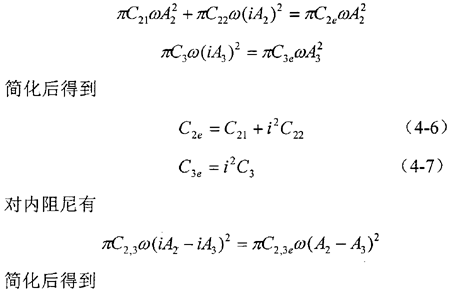 在圖4-3所示的動力學模型中,出現(xiàn)了具有并聯(lián)結(jié)構(gòu)的傳動分支,應(yīng)將其轉(zhuǎn)換為等效的串聯(lián)結(jié)構(gòu),以便應(yīng)用傳遞矩陣法建模和求解。對波發(fā)生器而言,扭轉(zhuǎn)剛度按式(4-9)計算。