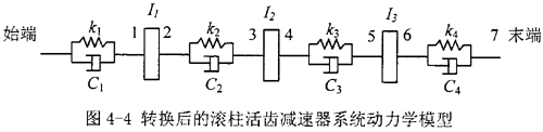 根據(jù)上述方法,可以初步建立起如圖4-3所示的系統(tǒng)動力學模型,為了能夠利用傳遞矩陣法對該系統(tǒng)進行動力學分析,需將各慣性元件和彈性元件向輸入軸轉(zhuǎn)換(也可向輸出軸或中間任一軸轉(zhuǎn)換,均不影響結(jié)果),構(gòu)成單一軸線的當量圓盤系統(tǒng)的扭振動力學模型。轉(zhuǎn)換中,按轉(zhuǎn)換前后系統(tǒng)的動能和勢能保持不變的原則,確定轉(zhuǎn)換后動力學模型中各元件的參數(shù)。