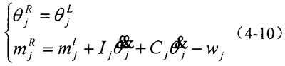 如圖4-6所示,第j個彈性元件的扭轉(zhuǎn)剛度為kj,扭轉(zhuǎn)阻尼為Cj,元件的左右兩側(cè)各連接一個慣性元件,左側(cè)慣性元件的右端狀態(tài)矢量等于彈性元件的左端狀態(tài)矢量,即θLj=θRj-1,mjL=mj-1R。右側(cè)慣性元件左端的狀態(tài)矢量等于彈性元件右端的狀態(tài)矢量,即θRj=θLj+1,mjR=mj+1L。彈性元件的內(nèi)力為彈性恢復(fù)力矩kj(θRj-θLj)和阻尼力矩Cj(θ&&j-θ&j)。根據(jù)力平衡關(guān)系可得