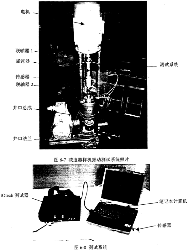 由于電動(dòng)潛油螺桿泵采油系統(tǒng)的效率從本質(zhì)上要遠(yuǎn)高于傳統(tǒng)的游梁式抽油機(jī)系統(tǒng)和地面驅(qū)動(dòng)螺桿泵采油系統(tǒng),而減速器作為電動(dòng)潛油螺桿泵采油系統(tǒng)的一個(gè)組成部分,其效率提升對(duì)整個(gè)系統(tǒng)的效率提升作用不十分明顯,另一方面,立式的試驗(yàn)系統(tǒng)結(jié)構(gòu)僅螺桿泵、減速器和電機(jī)三項(xiàng)的地面總高度就達(dá)到3.128m,如果測(cè)試樣機(jī)的效率,還要在樣機(jī)的輸入和輸出端上各安裝一個(gè)轉(zhuǎn)矩轉(zhuǎn)速儀,從而使得整個(gè)系統(tǒng)的地面高度達(dá)到4m多,己超出了實(shí)驗(yàn)室吊車(chē)的吊裝高度。所以,本章不進(jìn)行效率測(cè)試,只進(jìn)行振動(dòng)試驗(yàn)研究。