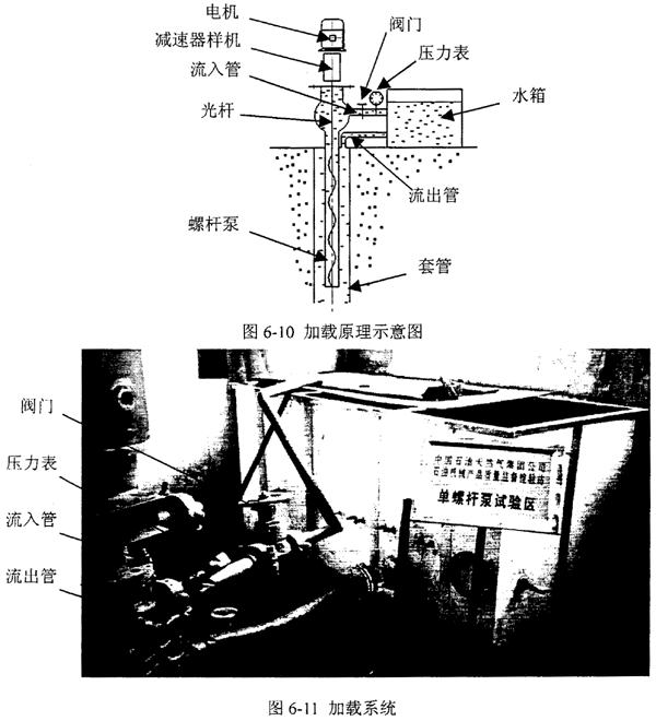 本試驗(yàn)井的加載是通過(guò)將并下的水舉升到地面時(shí),人為設(shè)置流水的阻力實(shí)現(xiàn)的。其加載原理見(jiàn)圖6-10所示。其中水箱的水由于重力的作用通過(guò)流出管流到地下。螺桿泵工作時(shí),將井下的水舉升到地面并通過(guò)流入管送回水箱中,在流入管的管道上設(shè)有閥門(mén)和壓力表,通過(guò)它們來(lái)調(diào)整流入管內(nèi)水的壓力來(lái)實(shí)現(xiàn)加載。具體結(jié)構(gòu)照片見(jiàn)圖6-11。