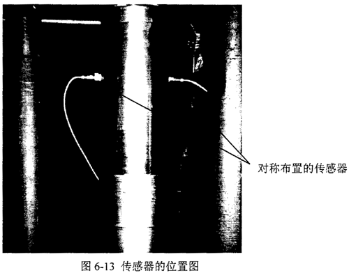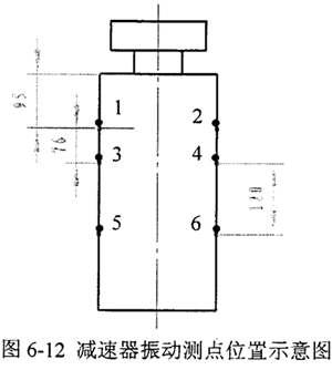 測(cè)點(diǎn)布置方案是關(guān)系到測(cè)量結(jié)果的一件重要工作,應(yīng)選擇信號(hào)傳遞路線最短、最能反應(yīng)減速器振動(dòng)的部位作為測(cè)點(diǎn)。本實(shí)驗(yàn)中測(cè)點(diǎn)對(duì)稱(chēng)布置在減速器外殼與活齒中點(diǎn)在同一水平線的兩個(gè)點(diǎn)1 、2 上,用以采集第一排活齒引起殼體振動(dòng)的信號(hào)。同樣,測(cè)點(diǎn)3 、4 采集第二排活齒引起殼體振動(dòng)的信號(hào)。測(cè)點(diǎn)5 、6 布置在輸出軸的支承軸承所對(duì)應(yīng)的殼體位置上,用以測(cè)量輸出軸軸承座的徑向振動(dòng)。各測(cè)點(diǎn)的位置示意圖見(jiàn)圖6-12,實(shí)際測(cè)試時(shí)傳感器的位置見(jiàn)圖6-13。