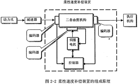 該柔性速度補(bǔ)償裝置設(shè)計(jì)為二個(gè)獨(dú)立的單元,安裝在減速器和執(zhí)行機(jī)構(gòu)之間。如圖2-2所示,簡單而言其組成包括:一個(gè)二自由度機(jī)構(gòu)、一個(gè)伺服電機(jī)、一個(gè)控制器以及三套編碼器?刂破魍ㄟ^編碼器監(jiān)控二自由度機(jī)構(gòu)的輸出軸(即執(zhí)行機(jī)構(gòu)的輸入軸)的速度,若速度波動(dòng)超過預(yù)設(shè)的許用值,則控制伺服電機(jī)調(diào)整二自由度機(jī)構(gòu)的一個(gè)輸入,從而實(shí)現(xiàn)速度波動(dòng)的柔性補(bǔ)償。