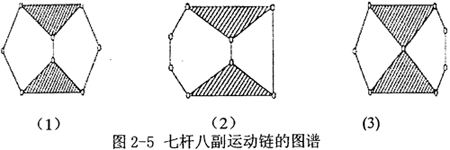 對于(5,5)來說,只有一種連接方式,作為一種混合動(dòng)力驅(qū)動(dòng)系統(tǒng)已有人做過研究,在本論文中,不能滿足設(shè)計(jì)要求,因此不可;而(9,11)及以上又有40個(gè)(或更多)運(yùn)動(dòng)鏈之多,且構(gòu)件多結(jié)構(gòu)復(fù)雜,研究起來非常困難,暫不考慮;先考慮(7,8)七桿八副機(jī)構(gòu),其構(gòu)建數(shù)量不是太多,結(jié)構(gòu)不是太復(fù)雜,共有3個(gè)運(yùn)動(dòng)鏈(如圖2-5),特定化后又有11種(排除同構(gòu)的機(jī)構(gòu))特定化導(dǎo)出機(jī)構(gòu),可以從中選擇可能適合的方案,因此以下將對(7,8)來詳細(xì)分析研究。