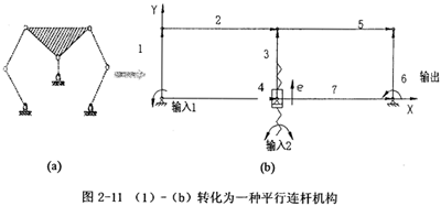 方案一:將(3)-(a)一般化鏈的所有連桿標(biāo)號,再分配其中三副桿1作為機(jī)架,哪圖2-9(a)所示,這樣特定化后,再進(jìn)一步轉(zhuǎn)化為(b)圖所示的裝置,連桿5改為滑塊,桿2作為第一輸入,第二輸入可以設(shè)定是滑塊5在桿4上的移動(dòng),可由伺服電機(jī)驅(qū)動(dòng),桿7作為輸出桿,可以滿足設(shè)計(jì)的初步要求。