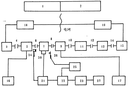 試驗時,通過控制臺1,2調(diào)節(jié)控制系統(tǒng)讓交直流機組18發(fā)出適當(dāng)?shù)闹绷麟妷菏怪绷鳒y功機3(工作于恒速電動工況)按恒定轉(zhuǎn)速轉(zhuǎn)動,通過聯(lián)軸器4,6和輸入轉(zhuǎn)速扭矩傳感器5與試件7輸放端(高速端)相聯(lián)接。試件7輸出端通過聯(lián)軸器8,10,12,14及輸出扭矩傳感受器9、升速用11、汽車變速箱13而與直流測功機15(工作于恒電流工況)聯(lián)接,驅(qū)使其發(fā)出適當(dāng)電壓的直流電,再通過交直流機組19將其逆變成為工頻北流電返回電網(wǎng),完成整個電功率封閉閉鏈。