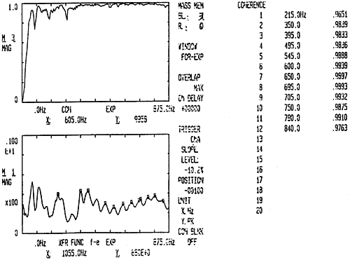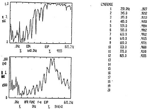 下面我們列出SHQ40振動系統(tǒng)850HZ-2KHZ間各階模態(tài)固有頻率的試驗值。如圖6-13示。圖中左上部為相干函數(shù),左下部圖為頻響函數(shù)圖,而右半圖部分為十三階到三十一階固有頻率值及其相干值。