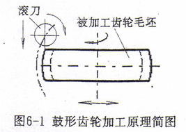 普通滾齒機(jī)具有主切削運(yùn)動傳動鏈、分齒運(yùn)動傳動鏈、進(jìn)給運(yùn)動傳動鏈和差動運(yùn)動傳動鏈,通過調(diào)整,能夠滿足圓柱齒輪和蝸輪的加工要求。本改造的內(nèi)容是要使其能夠滿足特定鼓度曲線的鼓形齒輪的加工要求,即在鼓形齒輪一定的軸向位置有一定的徑向變位,這就需要增加一個加工運(yùn)動的自由度。加工原理如圖6-1所示。