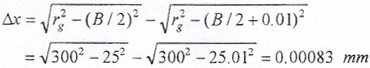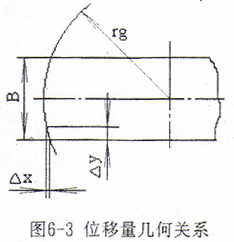 位移傳感器根據(jù)運(yùn)動的型式不同分為直線位移傳感器和角度位移傳感器,直線位移傳感器常見的有光柵位移傳感器、感應(yīng)同步傳感器等,它們可以直接安裝在所測直線運(yùn)動部件上,無傳動誤差影響,精度高。但是由于結(jié)構(gòu)的原因,它們需要非常精確的安裝基準(zhǔn)和合適的安裝空間,且通常情況下安裝定位較困難。由于光柵的密封性較差,光柵材料較脆弱,所以它們的抗污染性能和抗振性能也較差,而且所需防護(hù)裝置也較復(fù)雜,成本較高。角度位移傳感器最常用的有光電編碼器,它具有精度高,體積小,安裝方便、密封性好、抗污染和抗振性能好等優(yōu)點(diǎn)。本設(shè)計(jì)需測刀架的位移,在刀架上,切削冷卻潤滑油、切屑及粉塵的飛濺較嚴(yán)重,且不易設(shè)置防護(hù)裝置。如果采用光電編碼器需通過檢測絲桿的角位移間接檢測刀架的直線位移,但絲桿及傳動機(jī)構(gòu)具有的傳動精度和位移檢測精度是足夠的。另外,加工鼓形齒輪時,形成鼓度曲線的實(shí)際切削位置通常在曲線較陡的范圍,例如加工圓弧鼓度曲線,幾何關(guān)系見圖6-3,設(shè)位移圓半徑rg=300mm,齒寬B=50mm,當(dāng)Δy=0.01mm,則