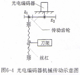 由于機(jī)床的刀架進(jìn)給絲桿的位置及結(jié)構(gòu)關(guān)系,通常不能將光電編碼器直接聯(lián)接在刀架進(jìn)給絲桿的端頭,需將絲桿的旋轉(zhuǎn)運(yùn)動通過一對齒輪傳至光電編碼器。機(jī)械傳動示意圖如圖6-4所示。