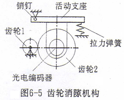 普通滾齒機(jī)具有刀架進(jìn)給絲桿的消隙機(jī)構(gòu),因此絲桿正反轉(zhuǎn)無間隙。齒輪的安裝有側(cè)隙存在,為了消除側(cè)隙對位移檢測影響,采用彈簧消隙機(jī)構(gòu),機(jī)構(gòu)簡圖如圖6-5所示。光電編碼器安裝在活動座上,其軸上裝有齒輪2,齒輪1與刀架進(jìn)給絲桿固連,活動支座在彈簧作用下繞銷釘轉(zhuǎn)動,壓迫齒輪2與齒輪1使其無側(cè)隙。由于光電編碼器的驅(qū)動力矩非常小,因此所需的彈簧的拉力也很小,不會對光電編碼的正常工作造成不良影響。