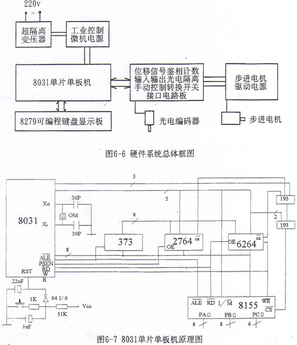 數(shù)控硬件由8031、外擴(kuò)一片程序存貯器芯片2764、外擴(kuò)一片數(shù)據(jù)存貯器6264和外擴(kuò)一片通用可編程并行輸入/輸出接口芯片8155、總線、片選擇碼電路、采用8279芯片的通用鍵盤顯示電路和位移鑒相輸入及驅(qū)動輸出的接口電路組成。數(shù)控系統(tǒng)的現(xiàn)場抗干擾性能直接關(guān)系到整個系統(tǒng)的成敗。在硬件方面,為了防止強(qiáng)電電網(wǎng)的電壓尖峰和毛刺對系統(tǒng)的干擾,采用抗干擾能力強(qiáng)的工業(yè)用微機(jī)電源、超隔離變壓器、片選法譯碼電路、光電隔離電路。
