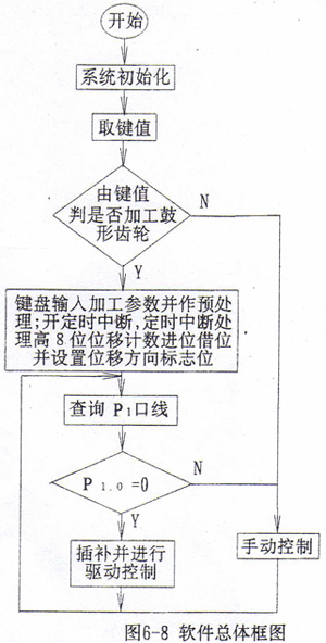 本系統(tǒng)的軟件采用模塊化設(shè)計(jì),主要包括系統(tǒng)初始化、數(shù)據(jù)輸入和顯示、插補(bǔ)運(yùn)算和驅(qū)動控制、定時中斷處理位移信號、自動與手動控制等功能模塊。軟件總體框圖如圖6-8所示。