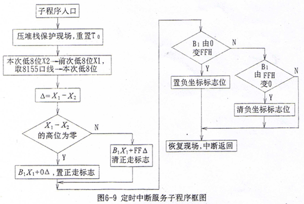 位移脈沖計(jì)數(shù)的高8位的處理采用差值法,設(shè)前后兩次的低8位二進(jìn)制數(shù)為X1、X2,高8位二進(jìn)制數(shù)為B1、B2,先求差值△=X2-X1,若△的最高位為1,則此時整個16位計(jì)數(shù)的十六進(jìn)制數(shù)為B1X1+FF△;若△的最高位為0,則為B1X1+0△。相應(yīng)的,若△的最高位為1時,當(dāng)前刀架向Y坐標(biāo)負(fù)方向運(yùn)動;若△的最高位為0時,當(dāng)前刀架向Y坐標(biāo)正方向運(yùn)動。而高8位由FFH變?yōu)?0H時,當(dāng)前刀架位置在Y坐標(biāo)大于零;高8位由00H變?yōu)镕FH時,當(dāng)前刀架位置在Y坐標(biāo)小于零,此時應(yīng)取Y坐標(biāo)補(bǔ)碼進(jìn)行插補(bǔ)運(yùn)算。定時中斷服務(wù)子程序框圖見圖6-9。