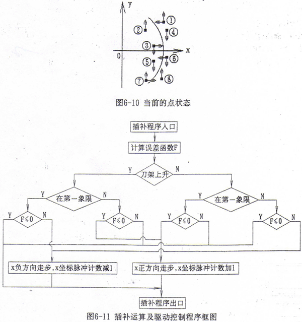 非圓弧曲線插補(bǔ)運(yùn)算時,首先根據(jù)當(dāng)前的Y坐標(biāo)值及插補(bǔ)曲線f(x,y)=0,求解出x坐標(biāo)理論值xt,設(shè)當(dāng)前的實(shí)際x坐標(biāo)為xr,令誤差函數(shù)F=xr-xt。對圓弧曲線,根據(jù)當(dāng)前的x、y坐標(biāo),計(jì)算x2+y2值,令誤差函數(shù)F=x2+y2-R2。根據(jù)當(dāng)前點(diǎn)在不同象限、當(dāng)前刀架的運(yùn)動方向及誤差函數(shù)的正負(fù),共有8種情況出現(xiàn)(如圖6-10所示),應(yīng)根據(jù)它們的狀態(tài)進(jìn)行不同的處理。①、⑥兩種情況應(yīng)使當(dāng)前點(diǎn)向x坐標(biāo)負(fù)方向走步;③、⑦兩種情況應(yīng)使當(dāng)前點(diǎn)向x坐標(biāo)正方向走步;②、④、⑤、⑧四種情況無需在x坐標(biāo)方向走步。由于在切齒過程中刀架的進(jìn)給速度較低,最高一般不超過30毫米/分鐘,兩次y坐標(biāo)計(jì)數(shù)脈沖間隔時間可達(dá)幾十毫秒,而插補(bǔ)運(yùn)算的時間不超過1毫秒,因此插補(bǔ)速度足夠。在刀架快速運(yùn)動時,插補(bǔ)有滯后,但此時不切削,這種滯后不影響加工。在插補(bǔ)過程中,顯示器輪流顯示當(dāng)前的x、y坐標(biāo)值,以利于操作者監(jiān)視加工情況,因此還需進(jìn)行顯示BCD碼的轉(zhuǎn)換和輪換的控制。插補(bǔ)運(yùn)算及驅(qū)動控制程序框圖見圖6-11。