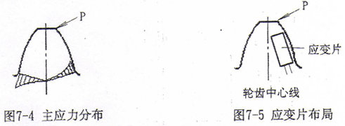 鼓形齒聯(lián)軸器內(nèi)外齒輪的嚙合齒對承受所作用的轉(zhuǎn)矩的作用。一般情況下,內(nèi)齒輪輪齒的剛度大于外齒輪輪齒的剛度[33][34][37],為了能更有效地反應應變,工作應變片貼于外齒輪輪齒的端面,溫度補償應變片貼于不受力的相同材料上。輪齒的應力狀態(tài)較復雜,在齒根處還存在應力集中。但總的來說,對于一個齒,其齒根主應力分布[118]如圖7-4所示,因此考慮工作應變片貼于輪齒中心線受拉應力的一側(cè),靠近齒根b邊緣處。這樣既不影響齒的嚙合,又能有效地反應接觸狀況,貼片布局見圖7-5所示。由于輪齒端面位置較為狹小,無法貼兩片應變片,因此采用單臂工作方式測試。