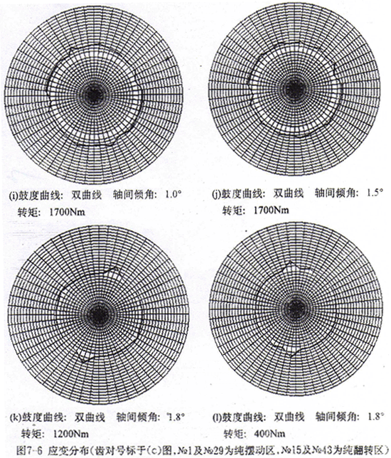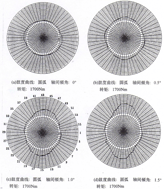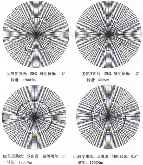 5.圓弧鼓度曲線與優(yōu)化鼓度曲線的測試結(jié)果相比較,在無軸間傾角的情況下,二者的最大應變無大的差異,只是分布狀態(tài)有所不同,這是由各種誤差的綜合影響所造成的。當軸間傾角逐漸增大,應變分布的最大值和最小值之差逐漸增大,但優(yōu)化鼓度曲線的差值變化較圓弧鼓度曲線的要小。當軸間傾角超過設計軸間傾角處于最大時,二者的最大應變量之比約為2;
