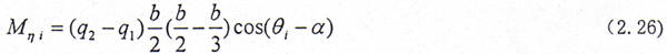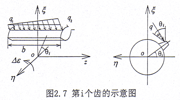 在外載荷較大時,則齒輪聯(lián)軸器內(nèi)外齒面之間接觸良好。設(shè)齒面上的載荷是線性分布,其集度分別為q1、q2,如圖2.7所示。在繞η方向給一小轉(zhuǎn)角△δ,則在第i個齒對產(chǎn)生的扭矩為Mηi。b是穩(wěn)態(tài)時內(nèi)外齒之間的有效接觸齒寬。