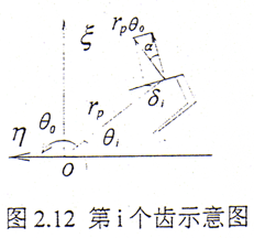 設(shè)內(nèi)、外齒輪有一相對扭轉(zhuǎn)振幅θ0,如圖2.12所示,則第i對齒面間相對滑動位移為δi=rpθ0sinα。第i對齒對上的摩擦力消耗的能量為