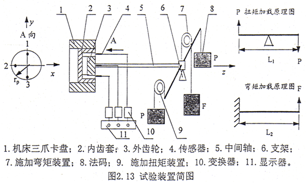 齒輪聯(lián)軸器的內(nèi)齒套固定在一個三爪卡盤上,聯(lián)軸器的外齒輪插入內(nèi)齒套與之相嚙合。采用3個電渦流傳感器,傳感器的布置見圖2.13,試驗臺的實拍照片見圖2.14。中間軸的一端與外齒輪固接,而另一端則用于施加扭矩和施加繞X方向的彎矩。扭矩和彎矩的大小由法碼的重量和桿或軸的長度來確定。作用于聯(lián)軸器上的扭矩