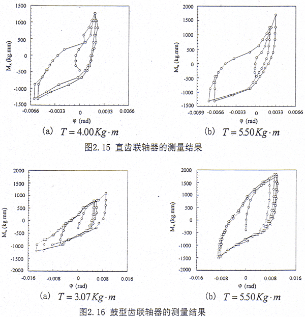 (5)對鼓形齒聯(lián)軸器在加載階段轉(zhuǎn)的平均轉(zhuǎn)角剛度ka進行了計算,結(jié)果如下:在T=3.07kg·m時,ka≈9.2×104kg·mm;在T=5.50gk·m時,ka≈1.1×105kg·mm。對于直齒聯(lián)軸器Mx-φ的關(guān)系呈現(xiàn)出非線性,轉(zhuǎn)角剛度ka即為曲線的斜率,從圖2.15可知轉(zhuǎn)角剛度ka是變化的。在轉(zhuǎn)角取大值時,ka值較大;在轉(zhuǎn)角取小值時,ka值比較小。為了便于比較,在此對文獻[31]中(其中參數(shù)為:鼓形齒輪聯(lián)軸器模數(shù)為2.5,齒數(shù)為35,T=15.0kg·m,鼓形量為113~140微米)的測試結(jié)果也進行了計算,結(jié)果為ka≈9.1×105kg·mm,造成二者結(jié)果的差距主要是外載荷和由于齒輪結(jié)構(gòu)參數(shù)的不同而引起齒對剛度具有相當大的差別,但從總體來說這一轉(zhuǎn)轉(zhuǎn)角剛度的數(shù)量級不大。因此在實際系統(tǒng)的動力學分析中,齒輪聯(lián)軸器的轉(zhuǎn)角剛度應(yīng)取一小量。