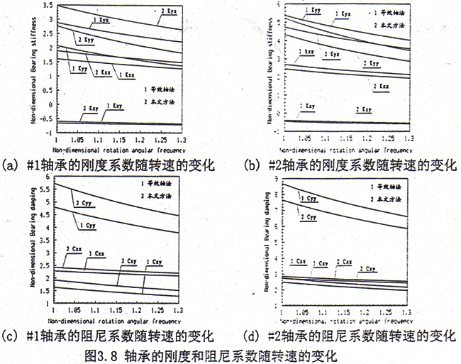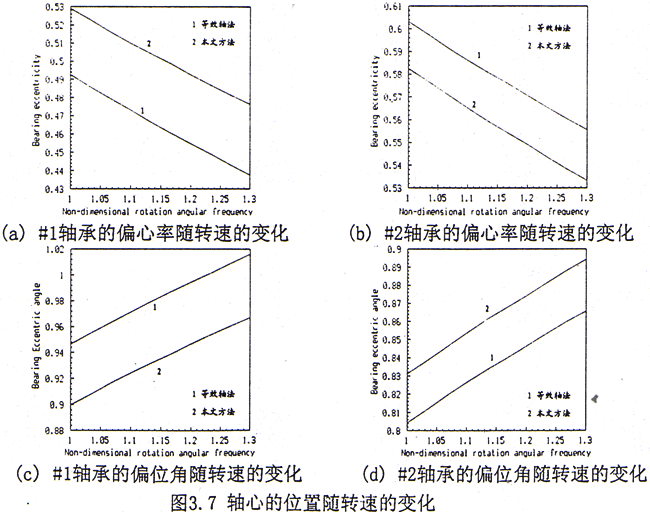 從以上的計算結果來看,用等效軸法計算軸承的軸心位置,#1軸承處的偏心率明顯偏小,偏位角偏大,而在#2軸承處則正相反。這表明采用等效軸法會使轉子的平衡位置產(chǎn)生較大的誤差,也預示著#1軸承和#2軸承之間負荷分配的變化。另外比較#1和#2軸承的結果,還可以看出,聯(lián)軸器的作用使得二個軸承的負荷分配趨于接近,而等效軸法從某種意義上講相當于二個轉子的直接對接,必將造成二軸承負荷分配不均,在工作轉速下各軸承處的負荷分配見表3.2,因此對軸承的受力來說這也正是采用齒輪聯(lián)軸器的優(yōu)點所在。從二軸承處的動特性來看,#1軸承的各項剛度和阻尼系數(shù)比等效軸法大,而#2軸承的各項剛度和阻尼系數(shù)則比等效軸法小,這歸根到底也是軸承負荷分配發(fā)生了變化的結果。如果采用單軸分析方法計算,以左側轉子為例,由于聯(lián)軸器的質(zhì)量與圓盤相比要小許多,系統(tǒng)近似為一對稱轉子系統(tǒng),則作用在#1和#2軸承上的負荷相差不大,因此二個軸承處的動特性系數(shù)也比較接近。由于軸承的靜、動特性發(fā)生了變化,因此勢必引起系統(tǒng)動態(tài)特性的變化。