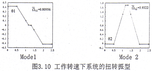 在ka=0.128不計內(nèi)阻尼時,工作轉速下系統(tǒng)的前12階彎曲振動復模態(tài)圖見圖3.9。從復模態(tài)圖上可以看出,在低階彎曲模態(tài)中,輪齒的變形是較小的,輪齒變形較大主要發(fā)生在高階模態(tài)中。這與實際情況比較接近,因為在實際的轉子系統(tǒng)中,輪齒的剛度一般比軸段的剛度要大許多,因此在低階的彎曲模態(tài)中,輪齒的變形體現(xiàn)不出來。系統(tǒng)前2階的扭轉振型如圖3.10所示。在前二階扭轉振型中輪齒變形也較小。